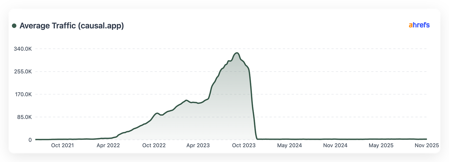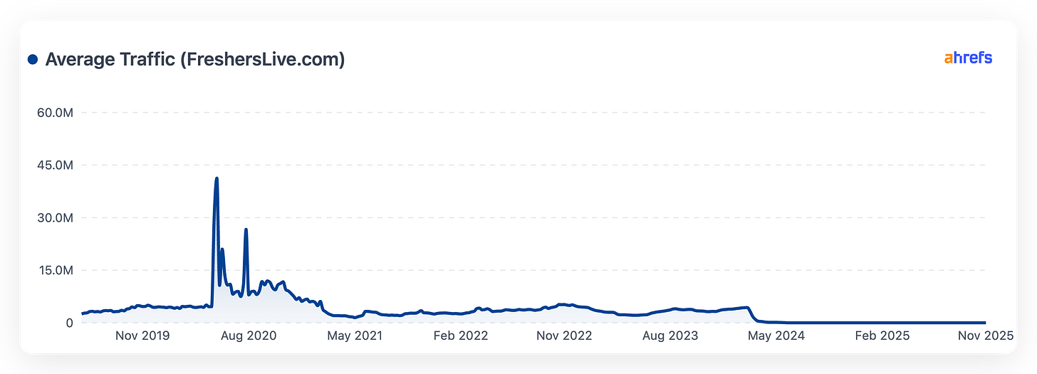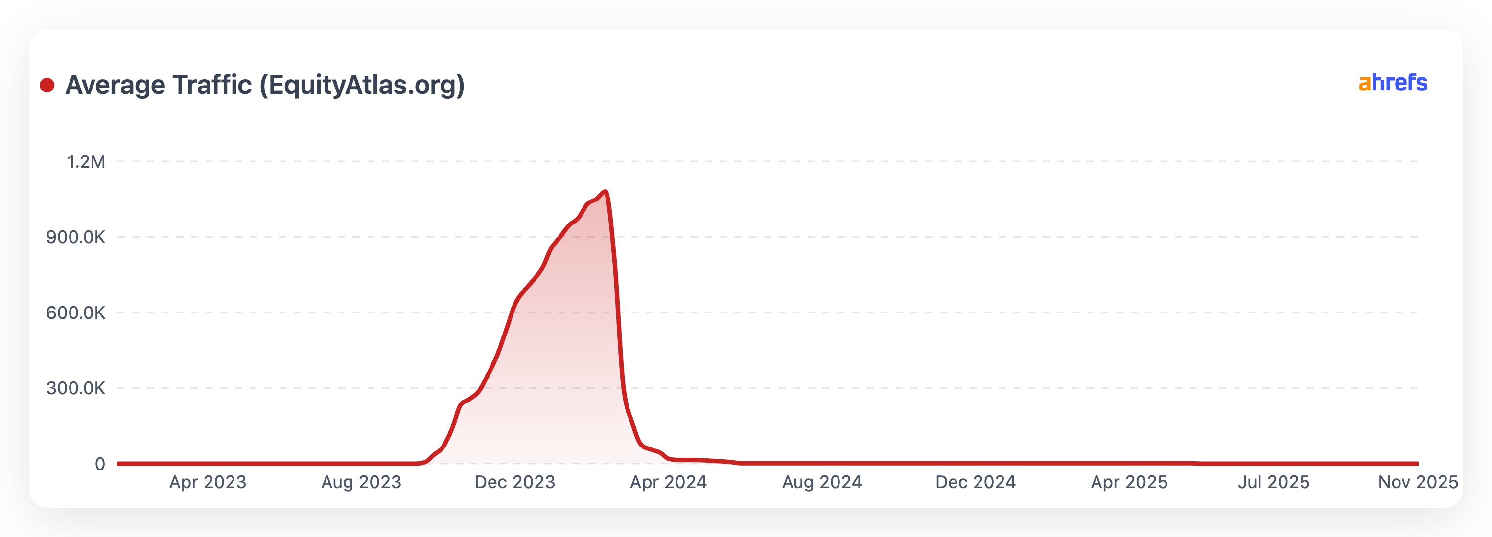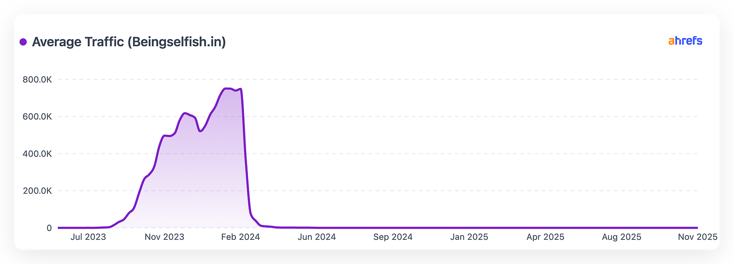 The result? Traffic collapsed from approximately 8.2 million monthly visits to zero. The entire site was deindexed.