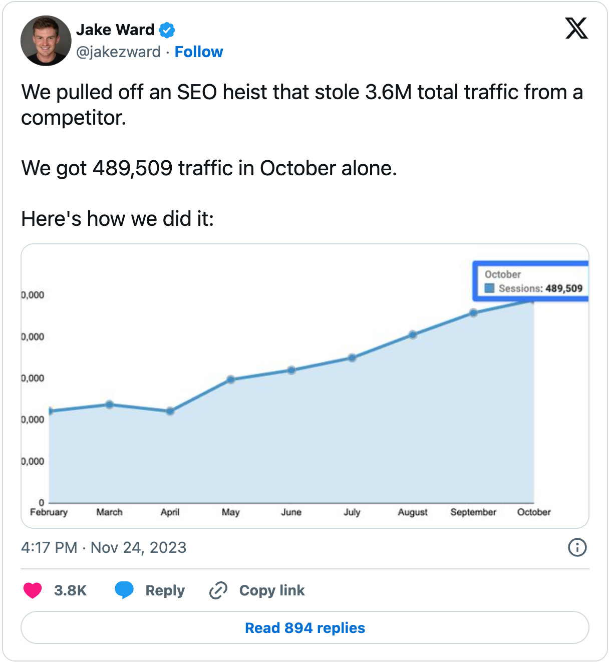 Initially, it seemed to work. Traffic surged from near-zero to 490,000 monthly visits. But then the operator bragged about it on Twitter, calling it “stealing” traffic. That got Google’s attention.
