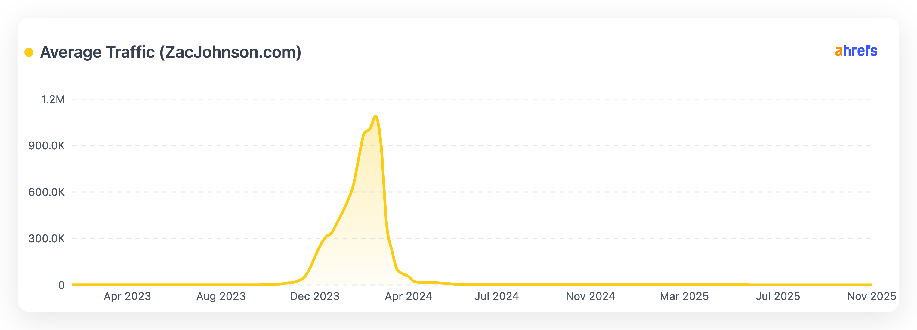 One of the most extreme examples is ZacJohnson.com. Between September 2023 and March 2024, this site published over 60,000 articles—averaging about 325 posts per day. Let that sink in: 325 articles every single day.