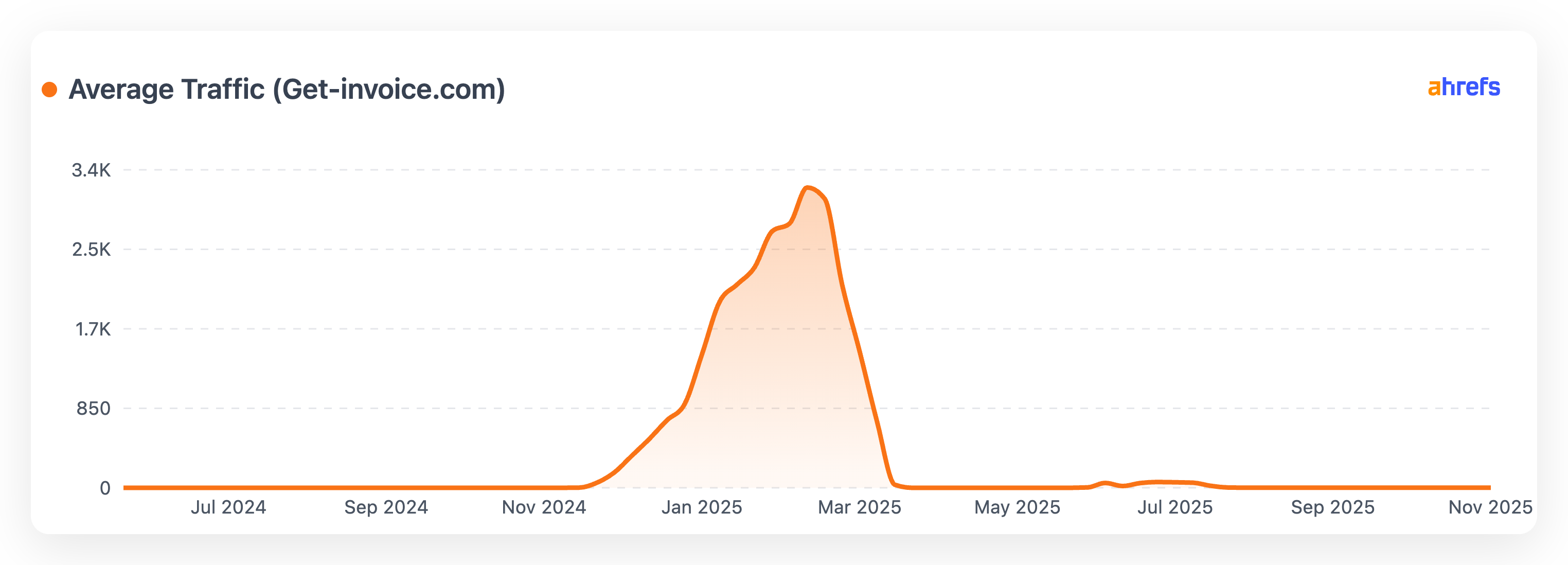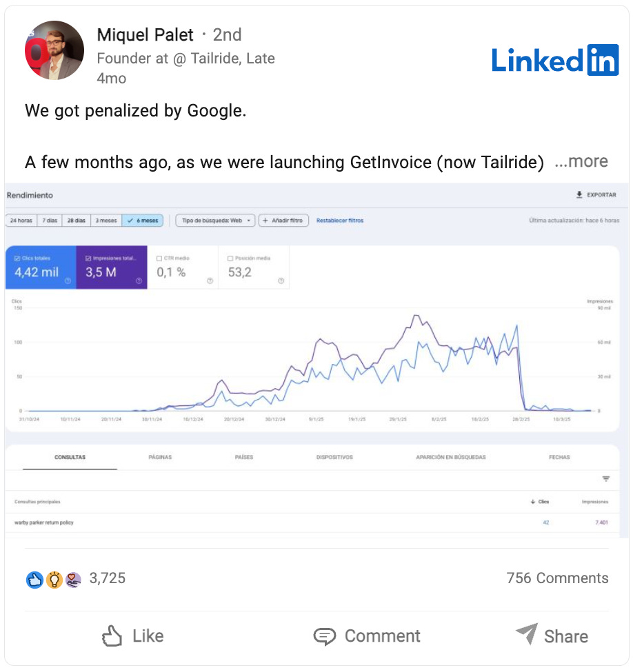 At first, they saw millions of impressions and hundreds of clicks. But on February 28, 2024, their traffic dropped to zero overnight. The penalty was so severe they had to abandon their entire brand and domain, rebranding from GetInvoice to TailRide.